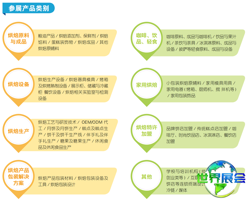 其他相关:手工烘焙与冰淇淋设备;烘焙检测实验室设备;展示柜、储藏与冷链设备;餐饮服务;设备制造;烘焙品牌加盟服务;信息技术;店铺装修;物流服务;行业媒体;培训教育机构等