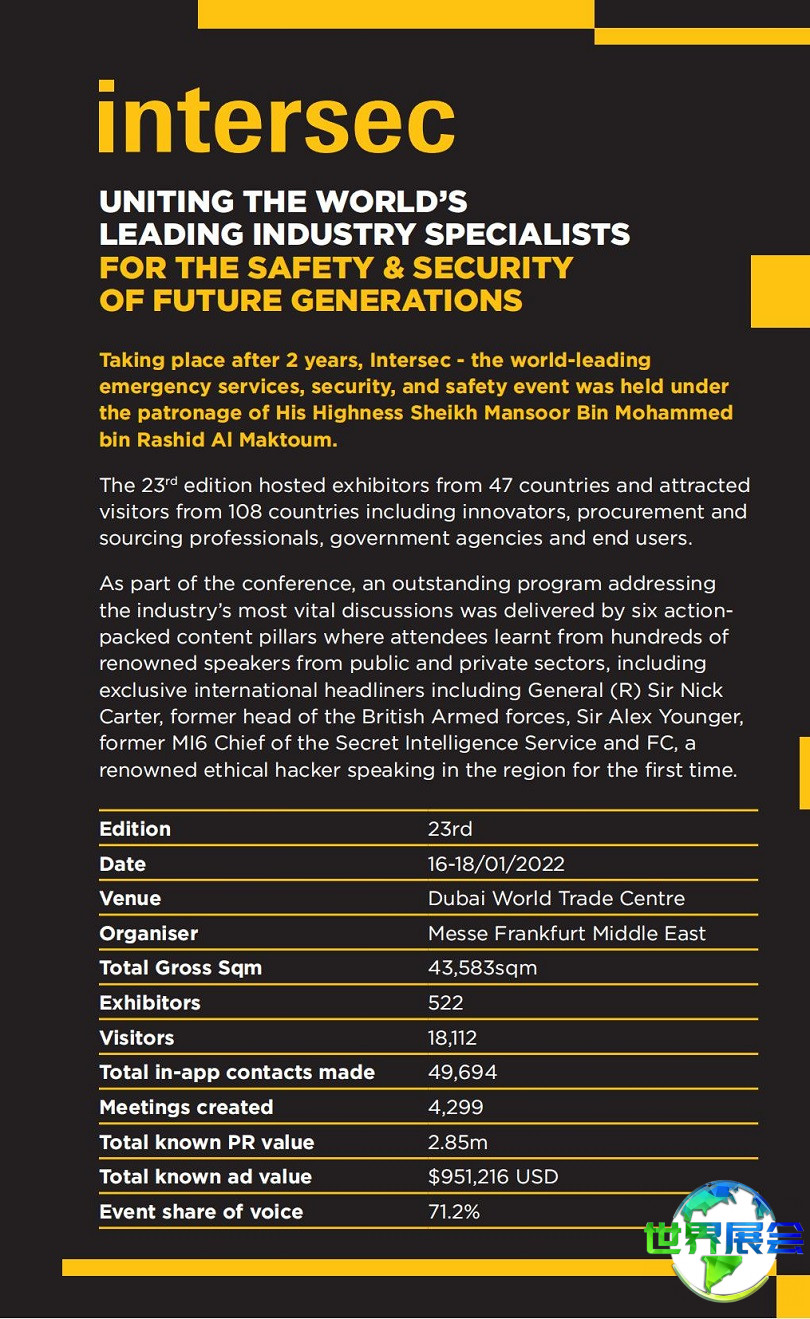 本资讯由中欧世界展会网工作人员编辑整理,我们是一个汇聚全球展会信息、提供门票购买、展位申请、设计搭建服务的平台,为您提供迪拜安防展展位预订支持。
