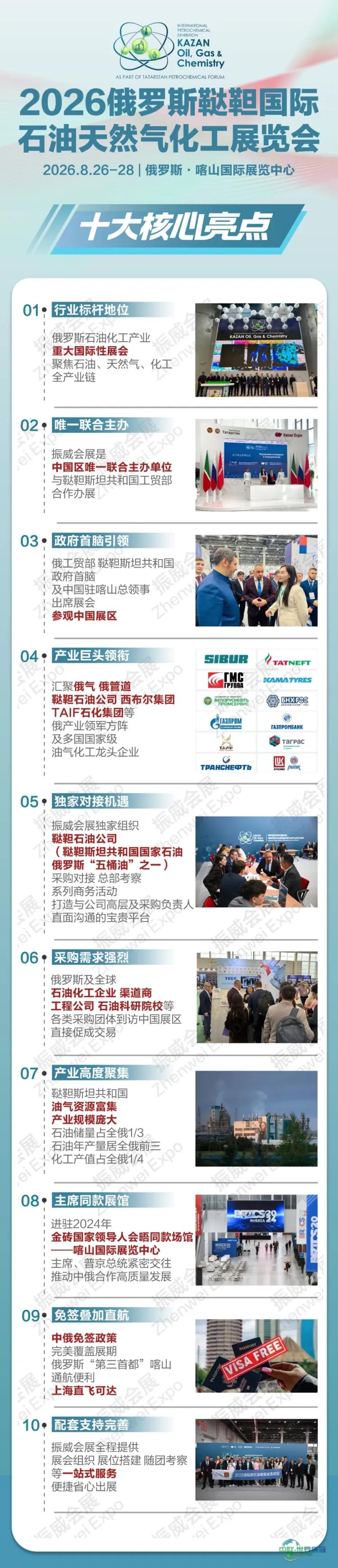 展会期间,振威会展将独家安排拜访鞑靼斯坦共和国国有石油企业、俄罗斯五大石油公司之一的鞑靼石油公司,并组织系列考察对接活动,创建与企业高层及采购决策者的直接沟通渠道,协助您捕捉全球商机、掌握合作关键信息。