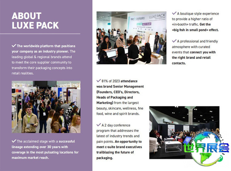 对于有意开拓北美奢华包装市场的企业而言,美国洛杉矶奢华包装博览会(Luxepack Los Angeles)是连接北美全渠道高端采购商、把握北美奢华包装商业机遇的最佳参展选择。