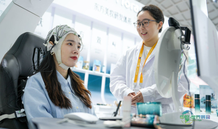4月14日,参展商在消博会现场演示美妆多维全息AI感官行为分析系统。新华社记者 杨冠宇 摄