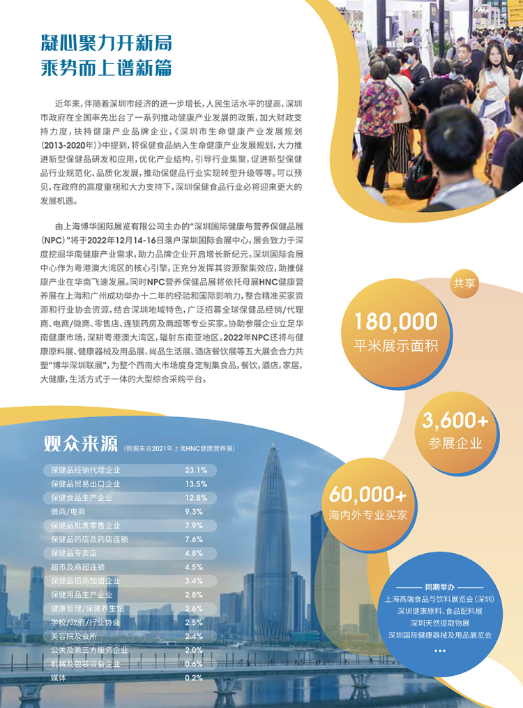 深圳国际健康与营养保健品展览会(HNC)将以国际化的运作和高效化的商贸展会组织模式,为展商和观众打造中高端营养保健品市场一流的贸易平台,与来自全球的专业买家分享行业资讯,在优质的展商汇聚中找到最合适的商业伙伴。