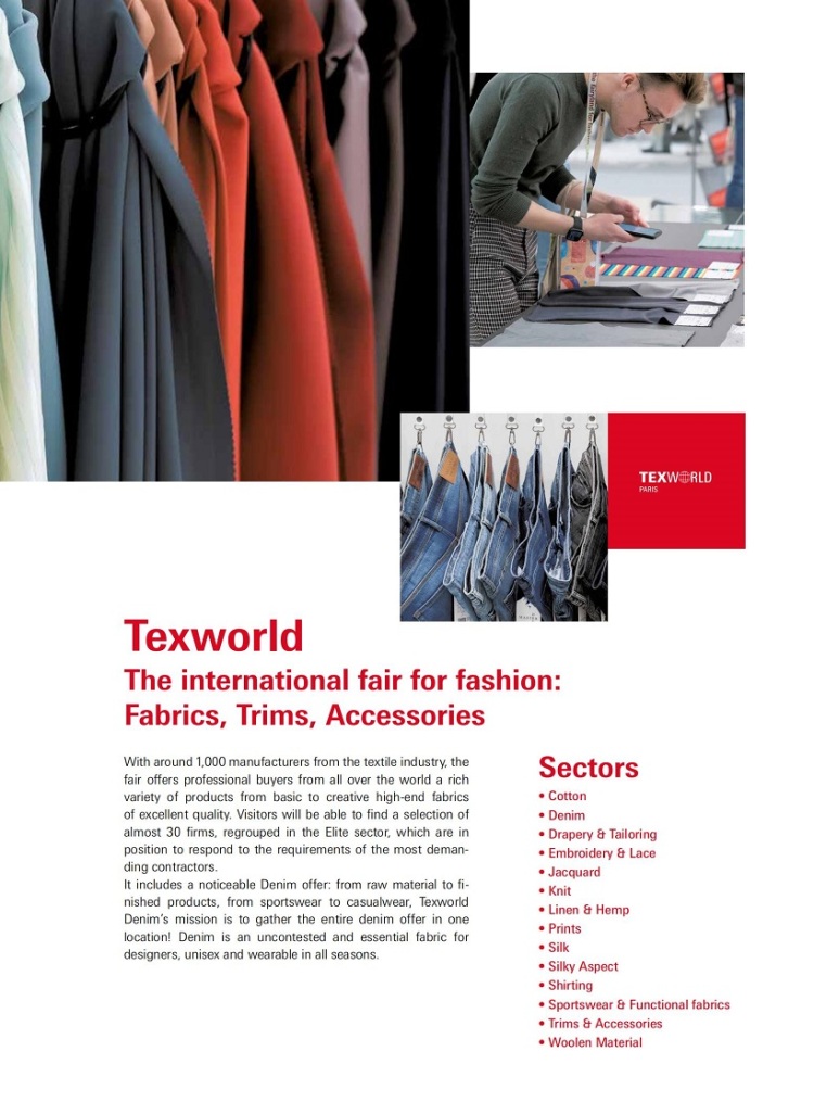 “Texworld”这一大型国际性面料展每年分春秋两季。展出规模之大、专业性之强、国际知名度之高,在纺织品面料行业都是首屈一指的。为了满足多年来全球服装面料企业期望参加该展会的热切愿望,自2008年春季展会起,该展会已加入“Texworld Clothing”展区,这是该展会2007年初移师法国巴黎Paris Le Bourget新展馆后的又一重大举措。主办方旨在将Texworld这一品牌延伸到整个纺织行业链,进一步打造欧洲时尚面料和成衣领域领先的一站式采购平台形象。