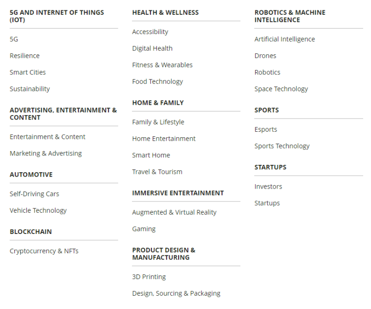 其它展区:节能环保等新技术、新能源产品等;智能家居、3D打印产品、无人系统、游戏类电子产品、可穿戴产品、传感器、机器人、健康&健身有关的电子产品、运动类电子产品