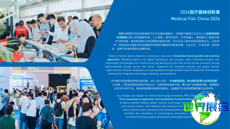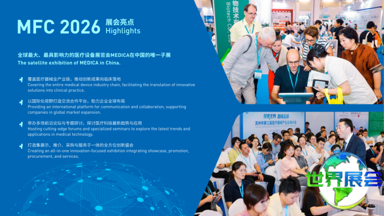 江苏苏州医疗器械创新展(Medical Fair China)作为全球最大医疗设备展MEDICA在中国的唯一子展。MFC以 “从创新到应用,助力医疗变革与全球化拓展” 为主题,汇聚全球领先的医疗科技企业、科研机构及临床专家,打造医疗创新成果展示与产业链协作的国际舞台,助力企业拓展市场、链接资源、洞察趋势、拥抱未来。