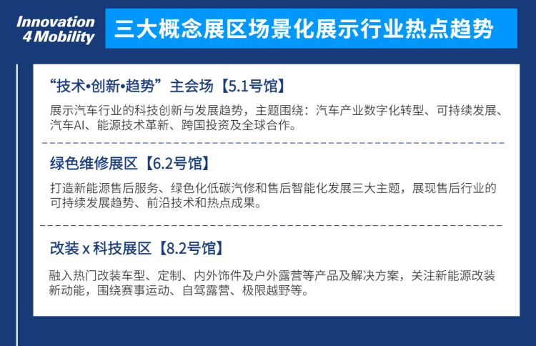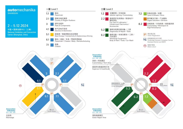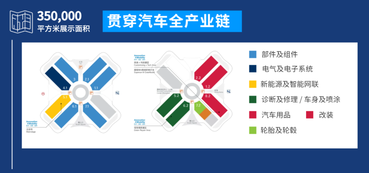 部件及组件:驱动部分、底盘部分、车身部分、标准件、汽车内饰、充电用附件、再制造零部件 电子及系统: 电机电器、车辆照明、电子系统、舒适性电子产品用品及改装: 装饰装潢、随车用品、订制改装、内外饰改装、通讯娱乐、特种车辆装配及改装、乘用车、小型商用车拖车及其配件用品 修理及维护: 维修站设备及工具、车身修补、喷漆与防腐保护、拖车设备/车辆维护及修理、废物处理及循环利用、车间安全及优化、维修站及分销点设备与管理、润滑油及 润滑剂