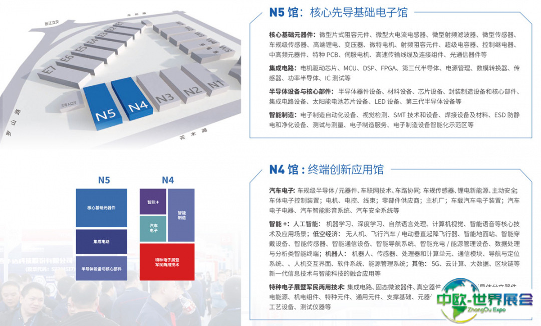 N1-N5馆:主要展示半导体材料、设备及人工智能技术,包含潮州三环、台芯电子等元器件企业