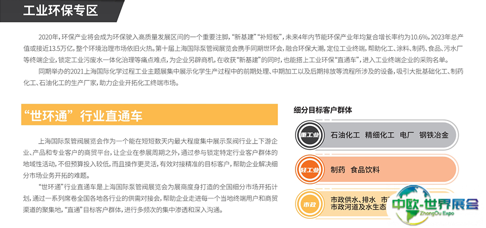 上海国际泵阀展览会(FLOWTECH CHINA)为了给广大观众呈现精细化的产品展示,特设工业泵阀、化工泵阀、市政管道和电机节能专区,为现场观众带来更优质的观展体验。