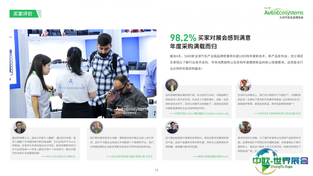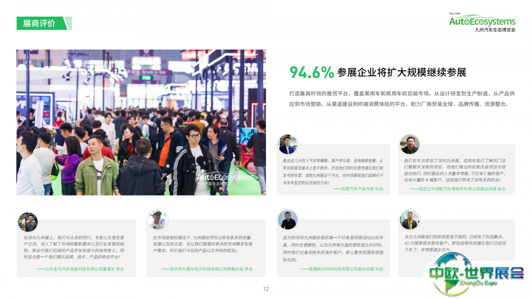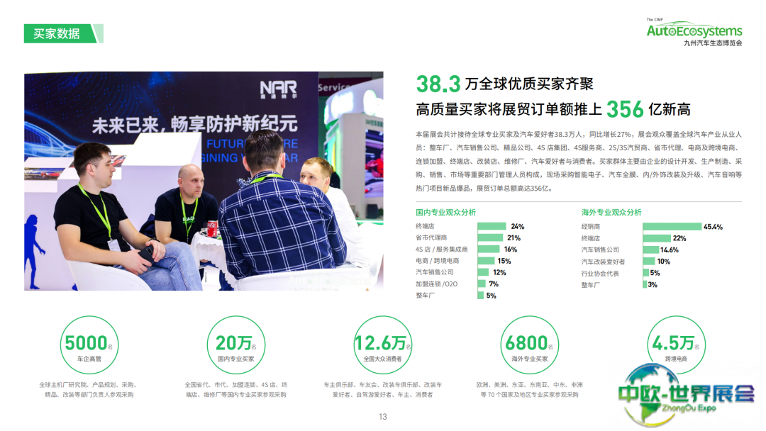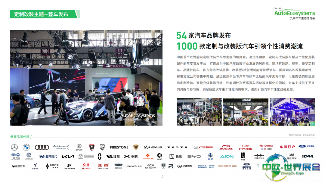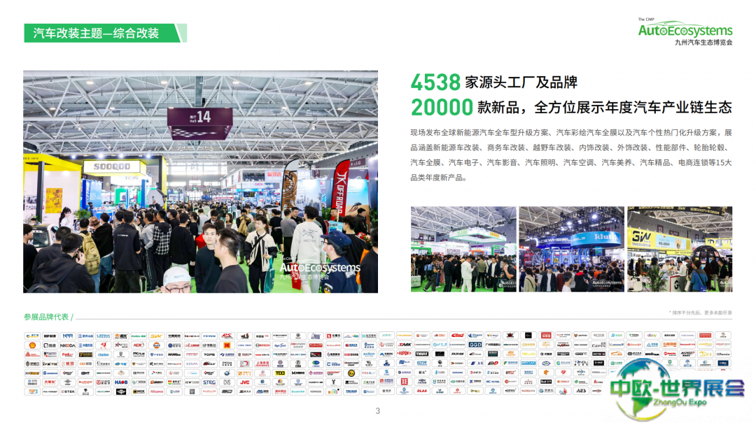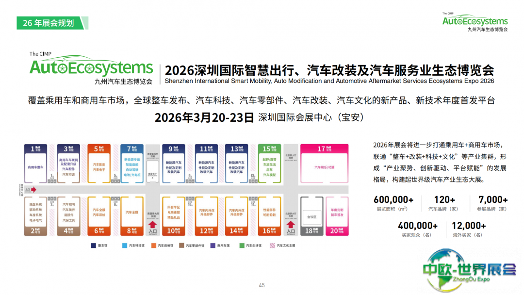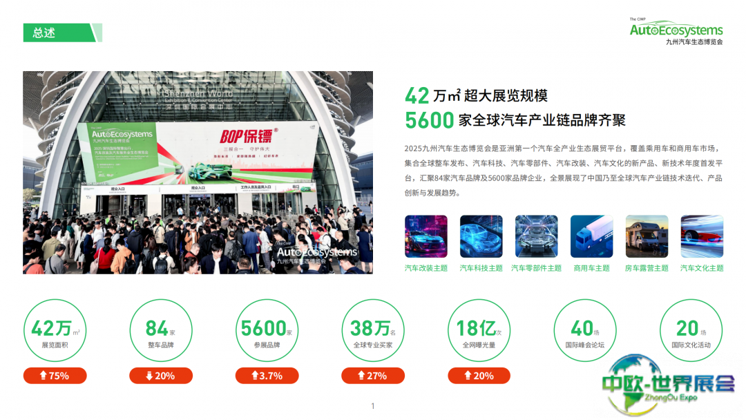 作为全球首个覆盖乘用车与商用车全品类,集整车发布、汽车科技、零部件、改装及文化于一体的B2B2C汽车生态展贸平台!九州汽车生态博览会预计规模超60万平米,吸引120家整车品牌、7000家产业链企业及40万+国内买家、12000名海外买家参会。这里不仅是全球采购与趋势发布的年度盛会,更是推动汽车产业链创新的重要驱动力。