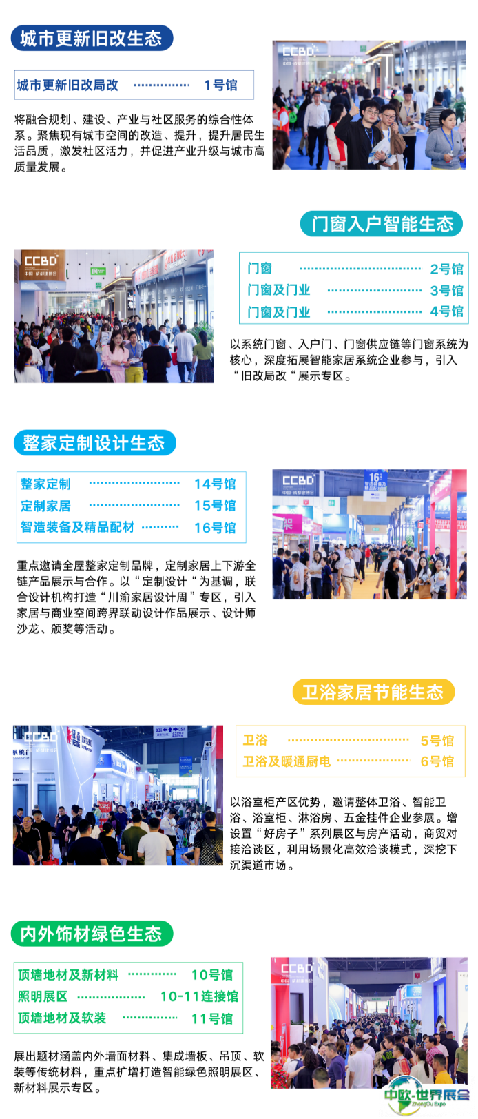 为精准对应建材家居产业融合发展趋势,2026中国成都建博会对展区规划进行了系统性重构,打破传统产品分类界限,创新性地规划了城市更新旧改、门窗入户智能、整家定制设计、卫浴家居节能、内外饰材绿色五大主题生态展区。