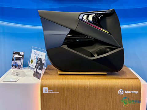 获奖作品采用3D视觉效果与半透明哑光镀铬饰面,应用于座舱及门板的环境氛围照明系统。该部件通过我们研发的puroclear®材料实现自修复表面处理与防护,生产过程中可完全免涂清漆——既显著降低排放助力环保,又因注塑模具内直接成型提升经济效益。产品通过高度自动化零排放3K工艺制造(高透明PC层实现景深效果,PC/ABS构成基材,PU形成表面),并结合模内镶件注塑技术融入半透明薄膜。