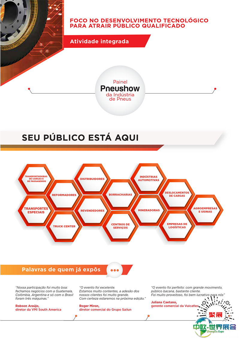 巴西圣保罗轮胎展PneuShow上届展会总面积24000平方米,参展企业448家均来自中国、泰国、智利、美国、西班牙、中国台湾、迪拜、哥伦比亚、德国等,参展人数达19500人。展会现场还将举办各种会议,探讨轮胎行业未来发展趋势。