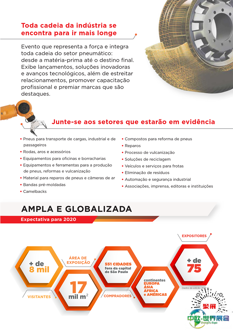 巴西圣保罗轮胎展览会(PneuShow)是巴西乃至南美洲最大规模、最专业的轮胎及相关产品展览会。与巴西圣保罗塑料橡胶展(Expobor)同期举办。自1996年创立以来,第一届开始就成为了主导行业和更新市场的前沿展会之一,现已也已成为巴西数一数二的橡胶技术及机械展。